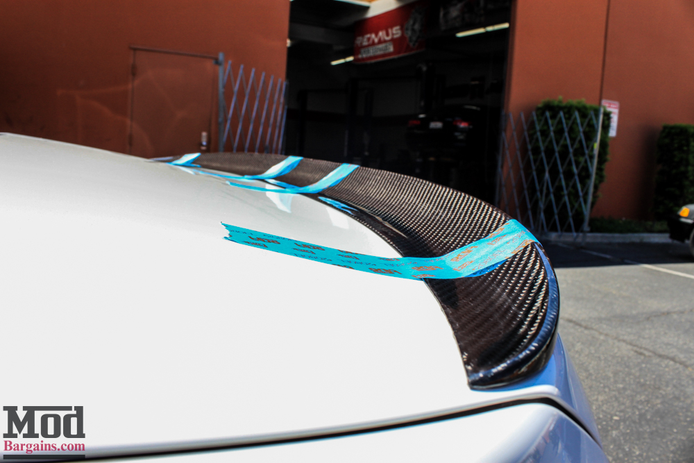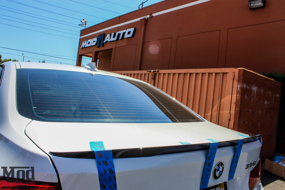 Here’s a closeup of the Performance Style Carbon Fiber Trunk Spoiler for BMW F30. The carbon fiber weave looks especially nice. Don’t mind the painter’s tape – the 3M Automotive Trim Adhesive securing the spoiler needs a few hours to properly set and cure, so painters’ tape is used to help keep things in position after install until the adhesive sets.