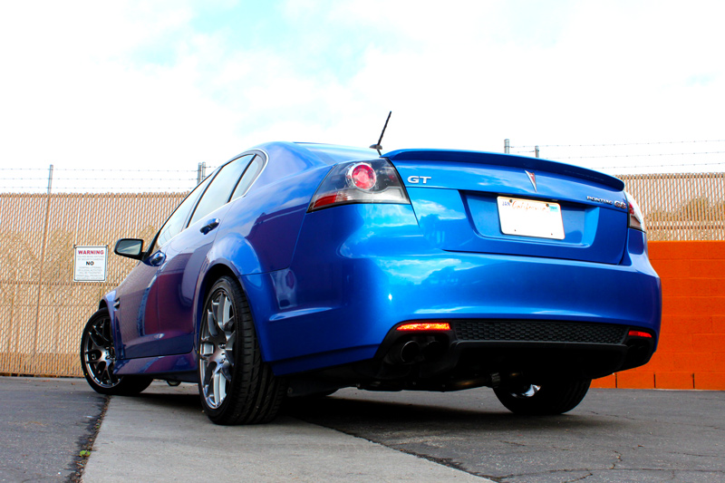 With Pontiac now a defunct, orphan brand, it’s rare you see a Poncho on the streets, or in as nice a shape as this 2009 Pontiac G8 in “Striker Blue” that came in today to be fitted with a set of VMR Wheels V710’s in Gunmetal Gray. We offer many varieties of Wheels for Pontiac G8, but these seem to be the perfect fit for this color combination. We then wrapped the VMRs in a set of Bridgestone Pole Position S-04s (245/40ZR19 front/rear). This owner got in touch with Modification Expert Elliott on the Pontiac G8 forums when the tires on the OEM wheels finally wore out, and given the scarcity of OEM wheels these days (just one is over $1100 now… for an OEM Pontiac wheel – think about that!), the VMRs are a perfect fit.