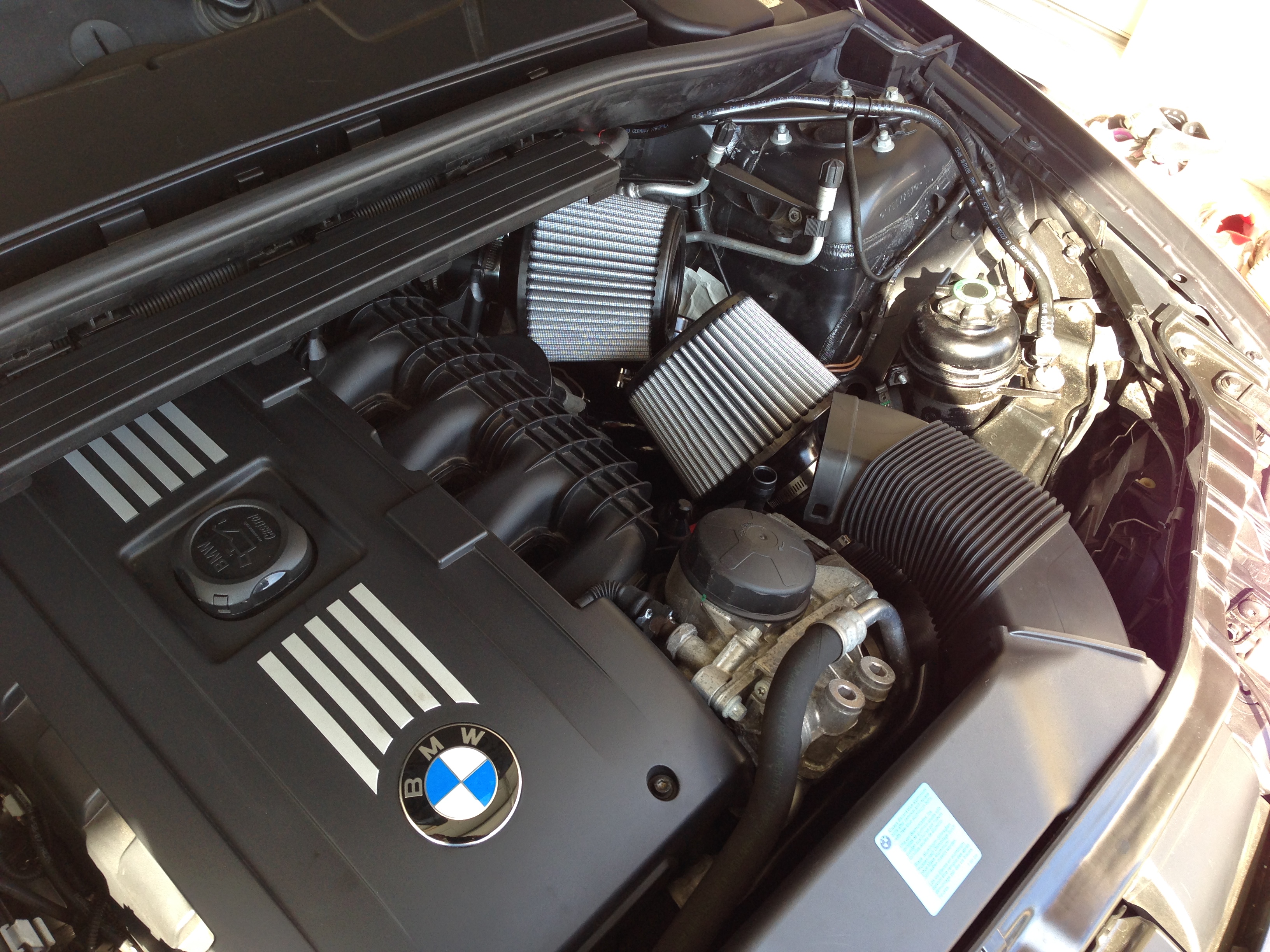 With the Turbo 1-series, BMW left a lot of power on the table with the twin turbo inline six motor. Which is why the first mod Linguist Casenas did was a Cobb AccessPort V2 for BMW N54 engines – like we said, BMW left a LOT of power available with the OEM engine and turbo setup – the tune alone is good for almost 100HP (30%!) and increases torque a whopping 120ft/lb (38% increase). It does not get any more dramatic than that! There are several tuner devices available for the N54 engine – including BMS, ESS, ActiveAutoWerke… The plus of a Cobb AP is that it’s not a piggyback unit and easily installs (and uninstalls for those of you who fear the dealer). Dollar for dollar, a tune is the single most powerful upgrade you can buy for your BMW N54 or N55 engine – and an AccessPort allows you to change maps to accommodate your other modifications are you make them. (Wait on that intake and exhaust til after you get a tune. Trust me. It’s worth saving up for. -Ed)