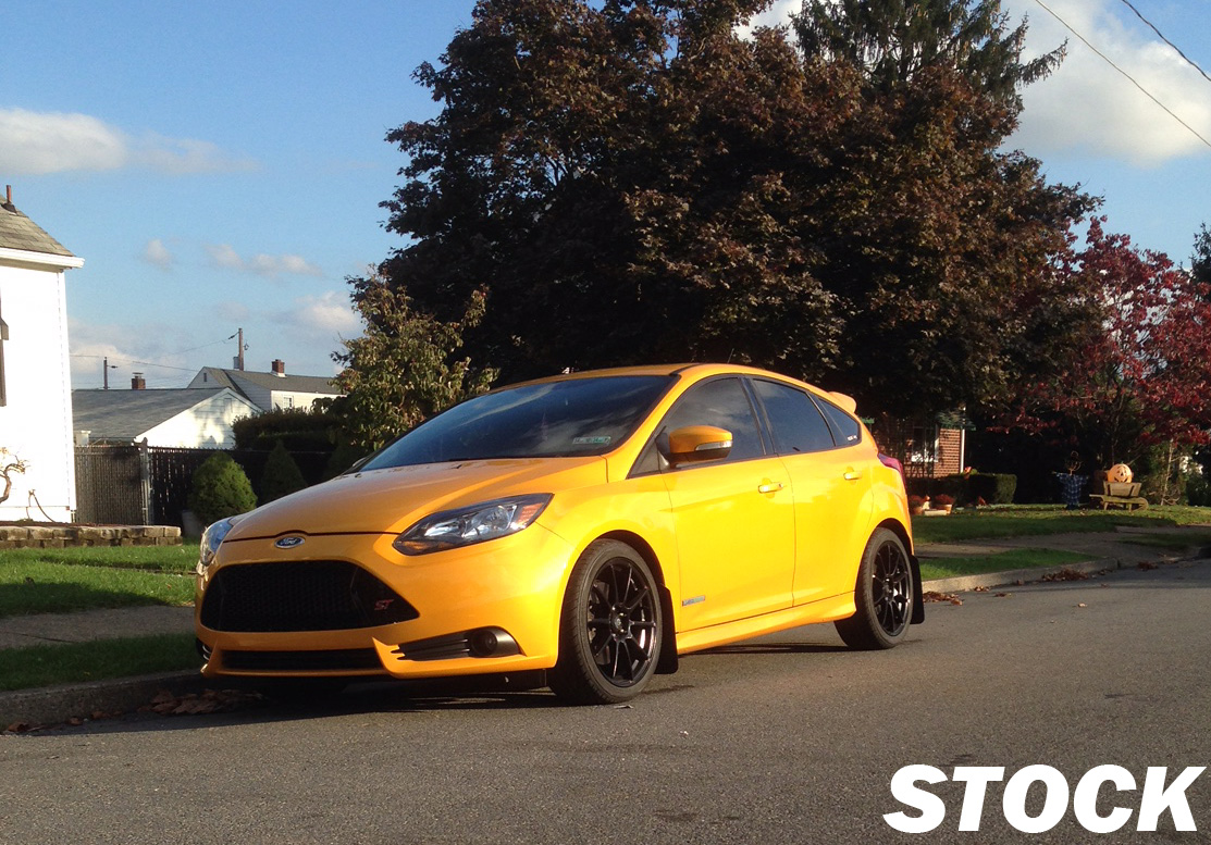 With the Focus ST, it’s important to note that 2013 cars use totally different springs than 2014 models – so unfortunately the Sportline for Focus ST only fits a 2013 model. Side by side, the pictures make the drop a lot more obvious. The drop seems to be right where it should be, leaving a little bit of gap above the tire without ‘tucking’, which is what you want out of a daily driven car on springs that you’re trying to get lower.
