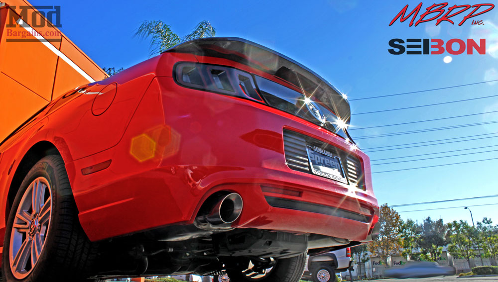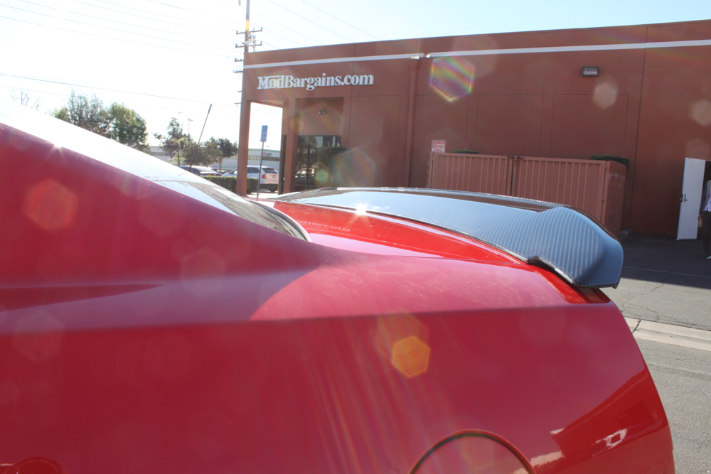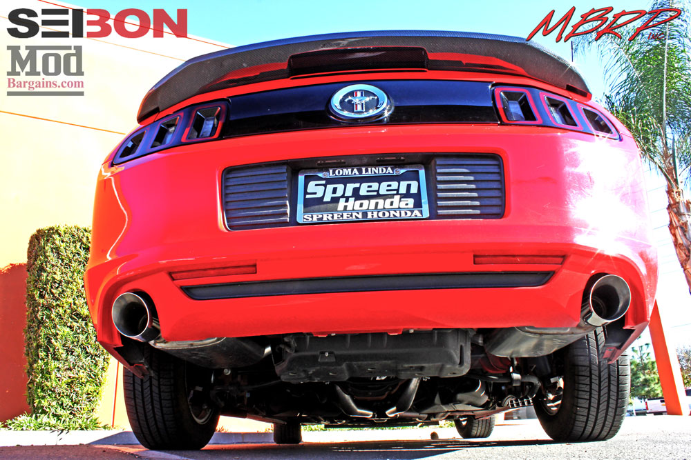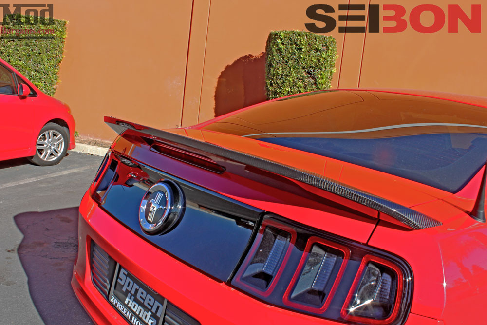 The next step to adding some visual flare was to go install a spoiler. Since the 2013-14 S197 comes factory with a blackout panel on the tail, the dark black/grey tone of carbon fiber ties into the dark accented look of the rear of the car beautifully, so the Mod Experts recommended a GT500 style Carbon Fiber Rear Spoiler for S197 Mustang from Seibon Carbon.