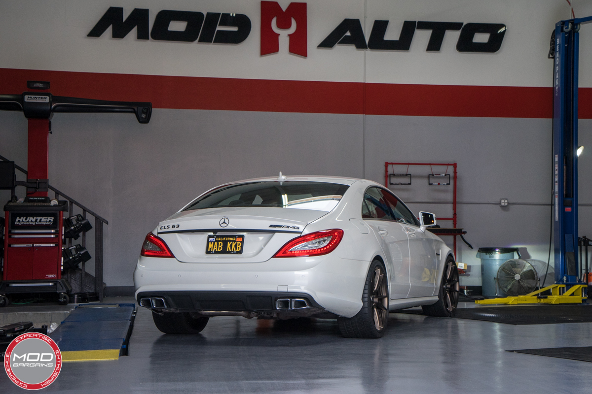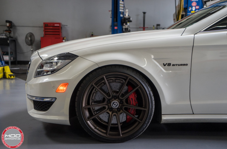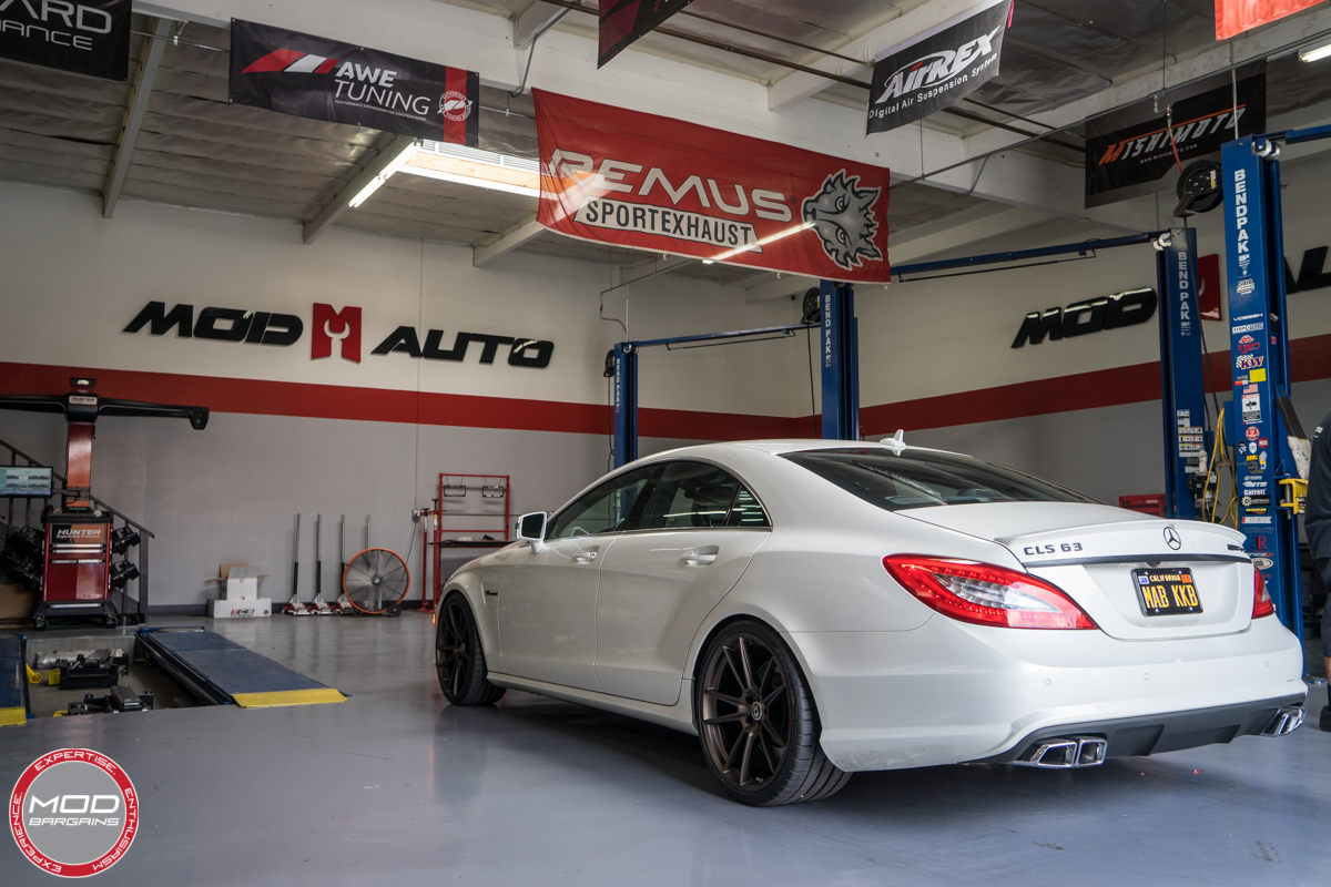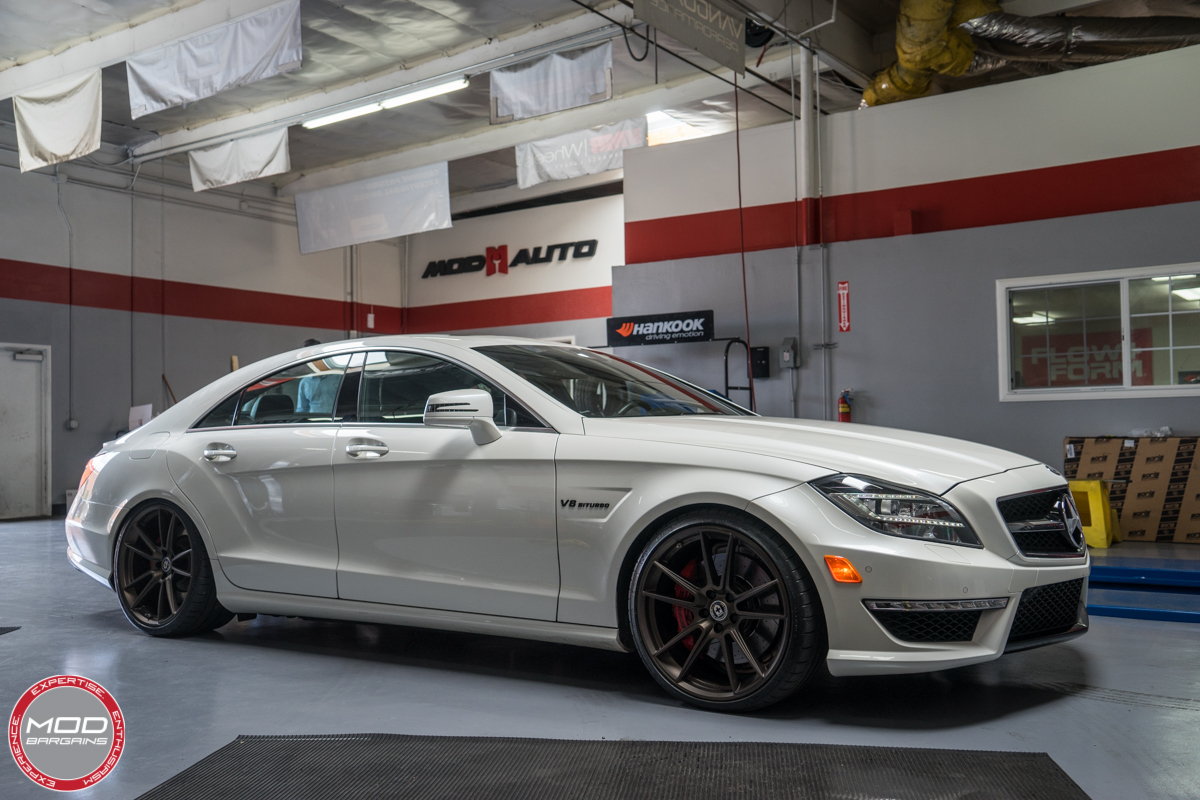 Recently we had Mike Brown, co-founder of ModBargains, bring his 2014 Mercedes CLS 63 AMG S 4Matic into the shop for some sweet upgrades. Mike is no novice when it comes to modifying his vehicles. His previously featured Cadillac CTS-V build is very tastefully done so we were thrilled to see he wanted to start modifying his Mercedes. Without a doubt the CLS63 AMG is a monster in its factory form, the twin turbo V8 power-plant produces so much power that engine modifications are not really the first thing one would look for. However, the area where almost every vehicle imaginable can benefit right off the bat is exterior modification. On this particular occasion Mike came in to get some new wheels installed as well as getting the car lowered.