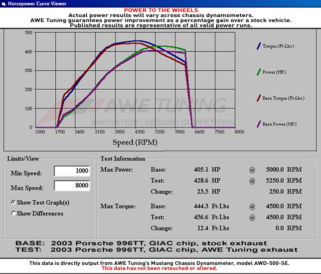 AWE Tuning backs up their claims with meticulously-detailed dyno graphs and data, verifying the net gain of 23hp and 12tq across the powerband.