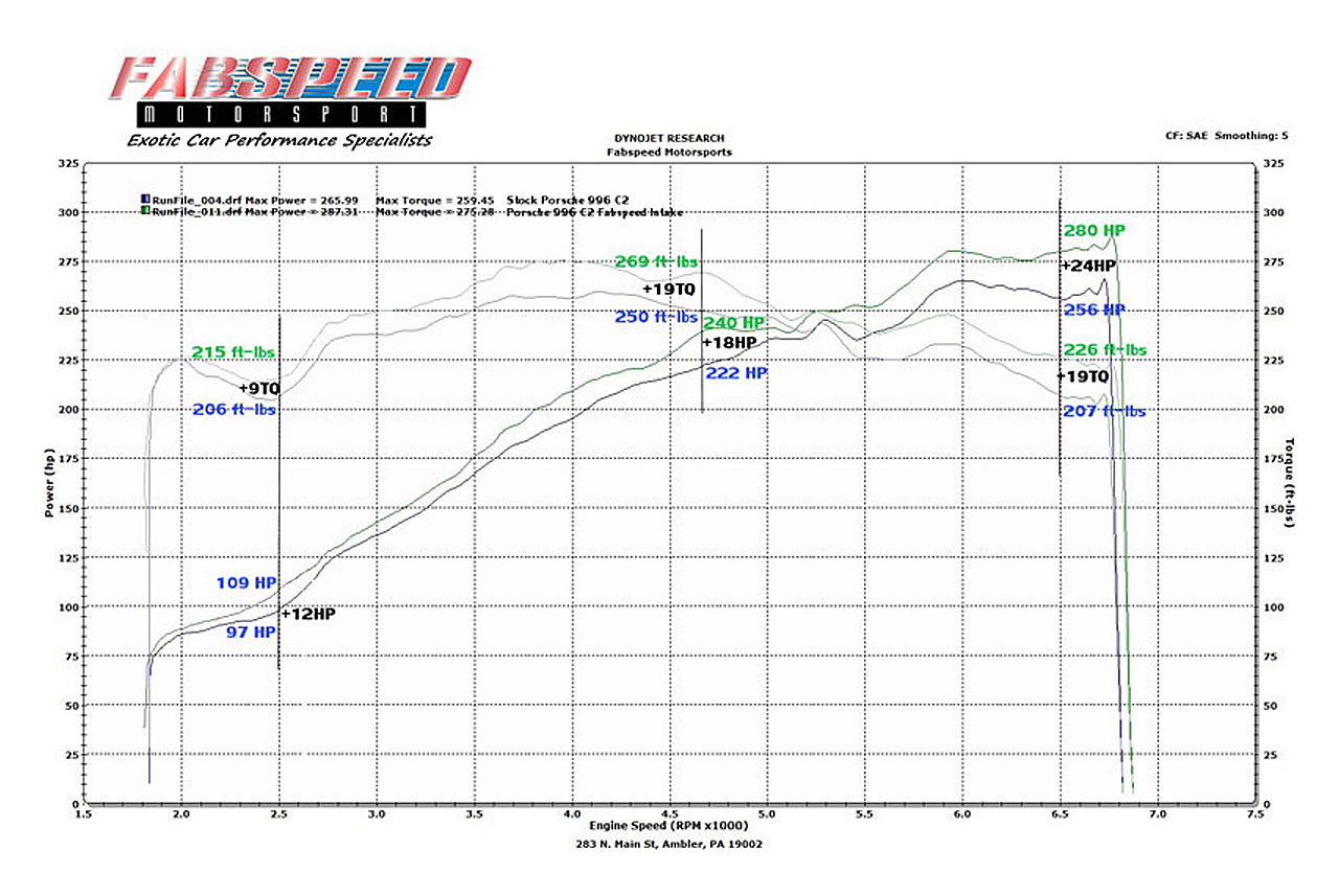 Now let’s say you have a turbo model or GT2. The Fabspeed Performance Air Intake for Porsche 996 Turbo offers a much more potent gain of 20.5 horsepower and 21.7 ft. lbs of torque.