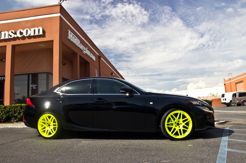 That’s right you read it correctly! ModBargains sold its very first set of Tennis Ball Yellow Forgestar F14 Wheels, and man are they something to see. The color is, as promised, indeed Tennis Ball yellow and extremely hi-viz. On this black IS, the Tennis Ball Yellow Forgestar F14s make a huge visual statement. The photos hardly do them justice, they’re so bright you almost need shades to even look at them. Love them or hate them, one thing is for sure: everyone will have an opinion on them. So, what do you think? Check out the photos and sound off below in the comments!