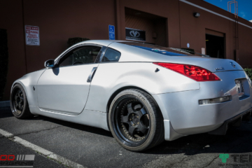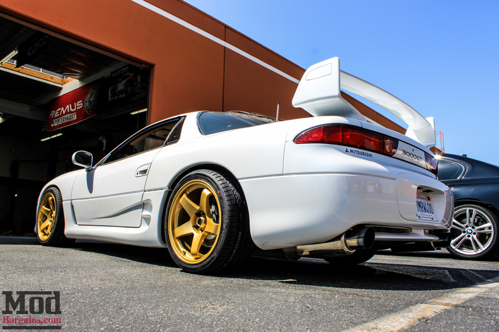 After some work, we got the 3000GT Wheels mounted and balanced and installed onto the car. The Race Gold powdercoat goes well with the white. After fitting the wheels, we pulled it onto the rack and dialed in the coilovers.