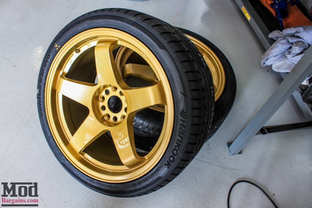 Despite sitting low on TEIN Coilovers, the car still had its stock wheels, and the owner had a very specific wheel style and fitment in mind, bringing in a set of ROTA 5-Spoke wheels, custom powdercoated race gold. While the fitment isn’t what we’d have recommended, we were able to make it work.