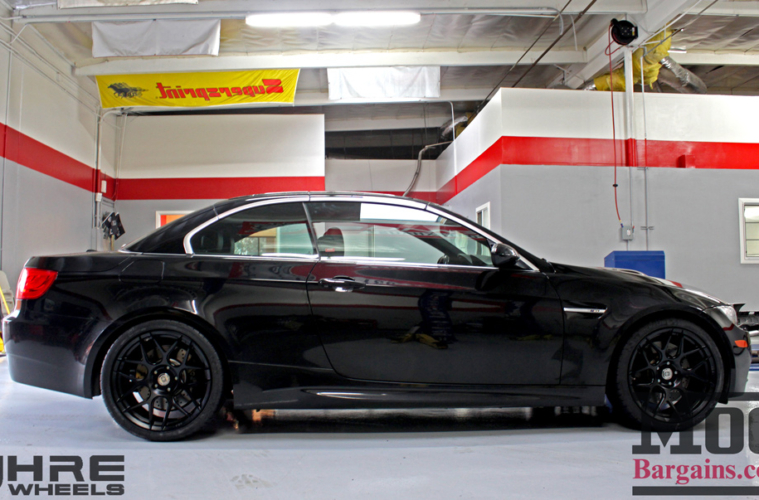 This saturday, this handsome BMW E93 M3 Cabrio popped by the shop to be fitted with a new set of shoes. Black with black hardtop and black interior, can you guess what color the wheels were? The new footwear for this E93 M3 Cabrio is a set of HRE FF01 Wheels for BMW, finished in Tarmac, creating the perfect triple-black aesthetic. When it comes to wheels, the fitment and offset is critical, especially for a BMW, where your fitment changes dramatically depending on whether it’s a 3-series, M3, xi and so on – fortunately the Mod Experts – our ‘wheel wizards’ as it were – know the offsets for late model BMWs better than the back of their hands.