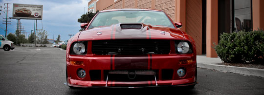 Yesterday, our friends from Racer’s Edge Tuning dropped by with their Twin Turbo Mustang to get this stallion fitted with some new horseshoes- namely some sticky new Falken 615 tires, wrapped around a set of polished Ford Racing FR500 wheels. Beefy 255/40/18s up front and went as wide as the deck of an Aircraft carrier out back with 295/40/18 rears to handle the massive power this pony’s putting down. Boasting 757hp/687tq on pump gas, this beastly Ford puts down a positively devestating 905hp/745tq on 109 octane race fuel. All that power comes from an RET-built twin turbocharged V8 engine specially built for breaking the 200mph mark at the Mojave Mile, and with the absurd tsunami of power this Pony’s packing underhood, it’s entirely possible. Check out the videos of the car’s twin turbo setup in action as well as our photos of the new meats installed on the car below.
