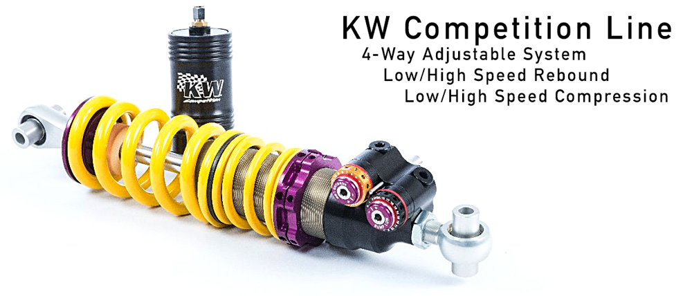 When you want to be serious, KW is serious. KW has a dedicated full time team devoted to only professional race car development and research. Here you can find the good stuff. While Clubsports are glorified V3’s with race parts inside, KW Competition coilovers are full custom one-of-a-kind systems which are built specifically to your vehicles racing application. While the V1-V4’s and Clubsports offer perfectly balanced off-the-shelf setups, upgrading to KWs competition line gives you access to KWs motorsport team and support staff.