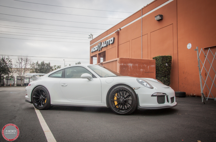 At ModBargains install shop, ModAuto, we’re known for our top of the line equipment and expert technicians – working on a proper supercar is right up our alley. That’s why yesterday Sr Mod Expert Alan helped his friend and customer out fitting a more sporting exhaust system to this fresh-from-the-dealer 991 Porsche 911 GT3. This monster of a road-going race car already sounded pretty aggressive from the getgo, but fitting this car with an upgraded Exhaust for Porsche 991 GT3 from Sharkwerks cranked the dial all the way up to eleven.