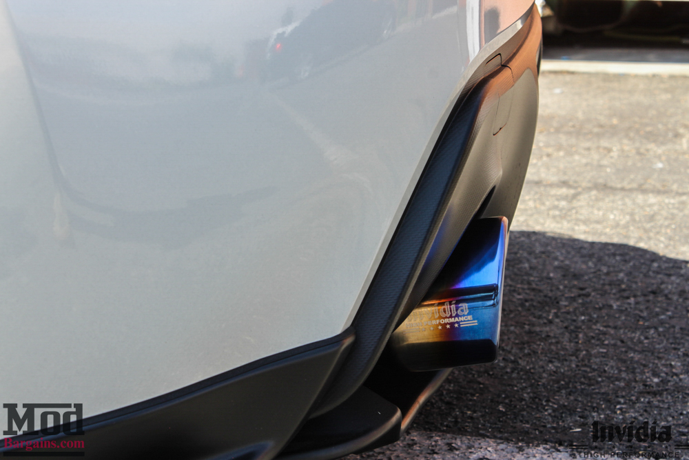 The Q300 exhaust tips feature a burnt titanium style finish on their exhaust tips, and fitted with the STi Lower Diffuser, it looks rather fantastic.