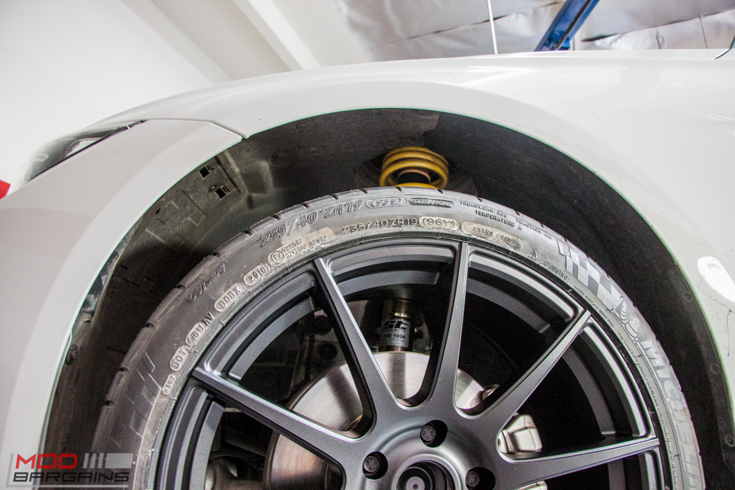 Next, we moved onto lowering the car’s suspension and replacing the factory wheels. We installed a set of ST Suspension Coilovers to bring the car down and eliminate the excess wheelgap. We have a set of ST coilovers on our Project Fiesta ST and they’re a great option for daily driven cars that want more performance and handling on the street. To compliment the drop, we ditched the snooze-worthy OEM wheels for a set of slick Forgestar CF10 Wheels, spec’d out at 19×8.5 / 19×9.5 in Matte Black finish, topped off with a set of 235/70-19 265/35-19 Michelin Pilot Super Sport Tires to provide the grip to match.