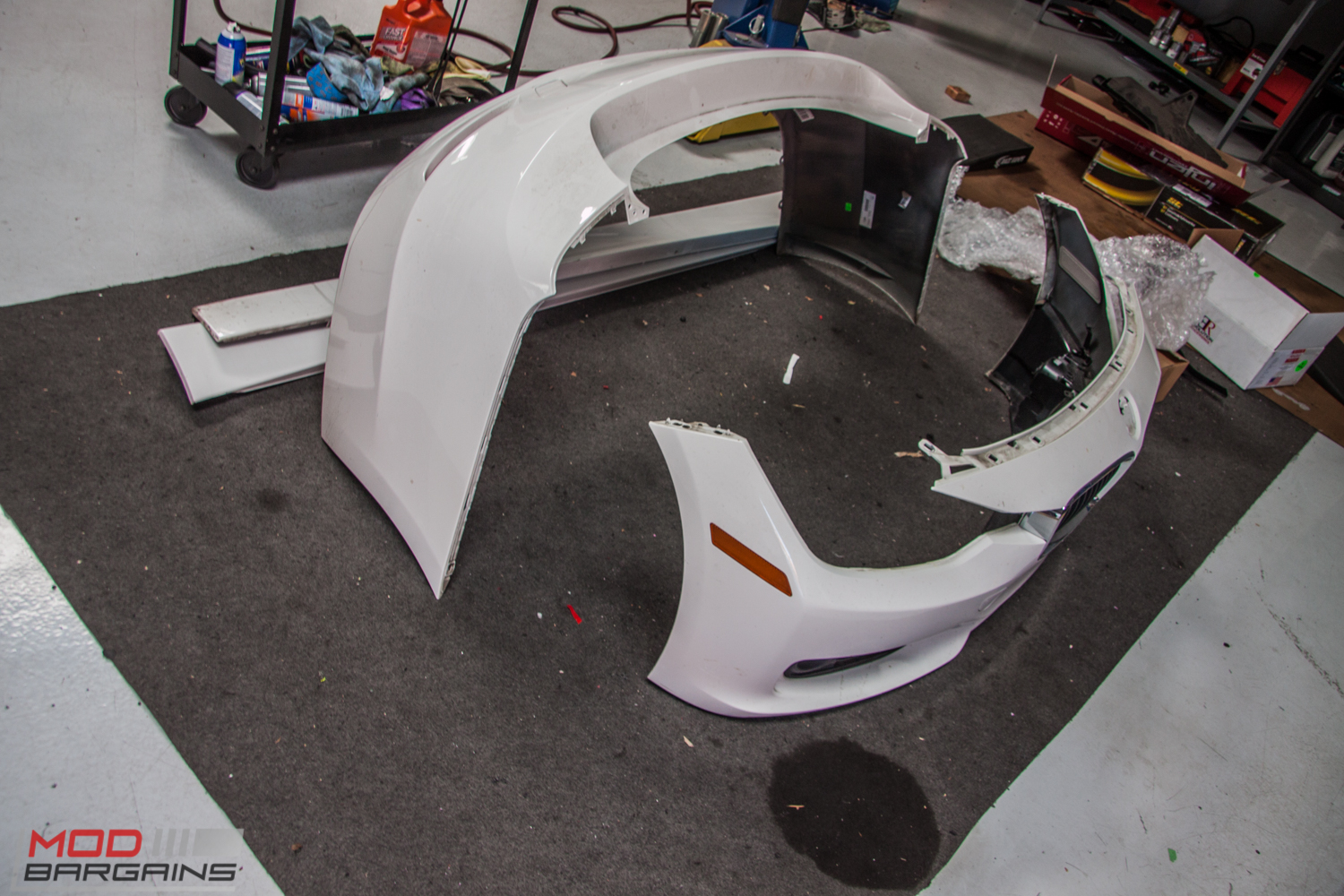 We started with the exterior by removing the factory front and rear bumpers as well as the side skirts – we won’t be needing those.