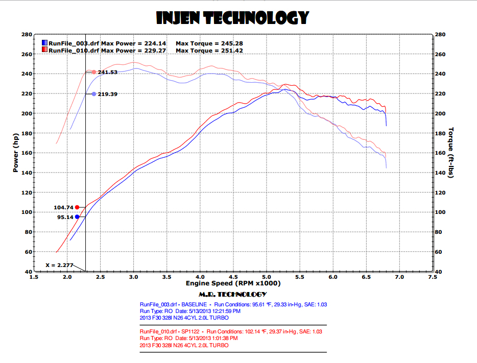Now for the Intake. The old N54 engines made a ton of HP at the wheels when you upgraded the intake (relative to the gains on other cars when fitting an intake), and the N20/26 continues that tradition despite being an Inline 4. Injen’s airbox style intake delivers significant gains at the wheels as well – the Injen Intake for BMW N20/N26 F30/F32 328i/428i delivers a whopping +22whp gain – that’s TWENTY TWO MORE HORSES, to the ground – but more importantly the gains are consistent across the entire rev band. Check out the dyno sheet for yourself: